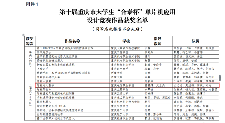 近日,重庆市教育委员会发布了《关于第十届重庆市大学生合泰杯单片机应用设计竞赛获奖情况的通报》,从通报中获悉,由beat365汽车与电子工程学院教师夏朝辉、文水兵指导的文尤龙、周旭梅、田杭、叶志4名学生,在全市23所参赛学校的414个参赛队中与众多本科院校学生同台竞技,最终以“智能老人看护系统”作品荣获重庆市二等奖。