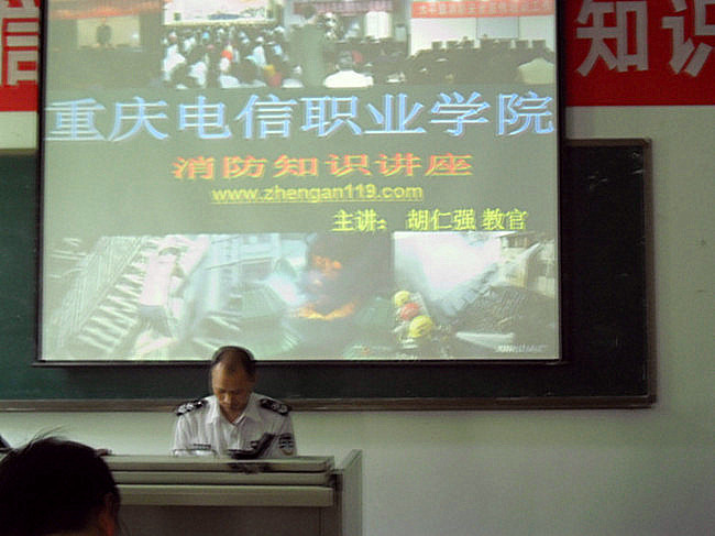 此次讲座学校诚邀重庆安居防火培训中心的胡仁强教官为大家讲解。胡教官通过图片展示以及生活中实际案例分析,告诉我们火灾的防范措施,火场逃生技巧等方面的知识,并演示了手电筒,防烟面罩的正确使用方法,使大家受益匪浅。