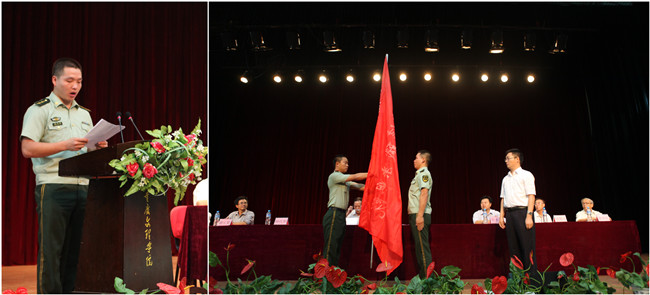 钟代军副校长代表学校向承训部队授了军旗。至此为期15天的新生军训正式拉开了序幕。