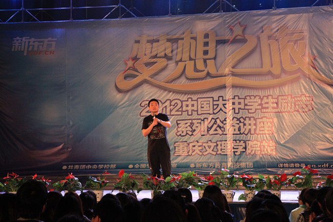 4月16日19:00,由共青团中央学习部、全国学联办公室、新东方教育集团共同举办的“梦想之旅”2012“中国大中学生励志系列公益讲座”在重庆文理学院红河学海广场隆重举行。重庆文理学院党委副书记兼纪委书记李德全、重庆文理学院副校长万书辉、beat365在线唯一官网副书记兼校长助理白成良和文理学院以及beat365近四千名学子齐聚会场。