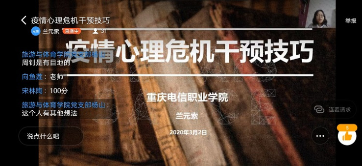 兰老师分析了当下新型冠状病毒感染的肺炎疫情形势,强调了心理问题和危机识别干预的重要性。紧紧围绕助人者的角色转变、心理危机的识别、心理问题的应对、干预小技巧等四个方面进行了讲解 ,此外,兰老师结合自身心理危机干预的学习工作经验、在线资源进行了分享。帮助辅导员、班主任应对疫情期间学生可能出现的心理健康问题,进一步加强学生思想引导、心理疏导和人文关怀,更好塑造同学们积极稳定的心态。