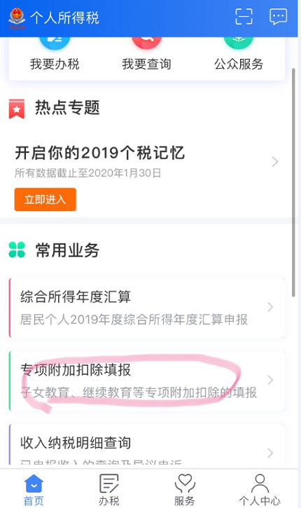 下载国家税务总局发布的个人所得税App并注册,已注册的直接登录,如需完善专项附加扣除信息,点击首页的专项附加扣除填报,扣除年度选择2019年并根据实际情况填写所涉及的专项附加扣除信息,根据步骤提示依次填写并提交申报;若已填报无需完善的,在首页的专项附加扣除信息查询中查看自己所填信息是否准确。