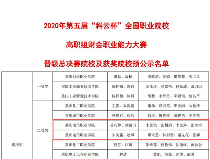 喜迎学校党员大会,经管师生来献礼!11月7日,2020年第五届“科云杯”全国职业院校(高职组)财会职业能力大赛网络选拔赛正式开赛,经济与管理学院2018级财务管理专业学生张晨韵、李思棋、张雪梅、李文琳及2019级财务管理专业学生覃天艺、张娜、林彭莹、谢先花组成的两支队伍分别在吴巧婷、徐南书、朱美嬴和赵琴老师的指导下,冷静发挥,凭借扎实的专业功底,两支队伍均荣获全国二等奖。
