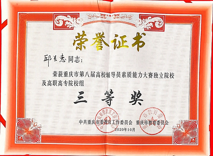 11月18-20日,重庆市第八届高校辅导员素质能力大赛在重庆交通大学举行,教育与设计学院、旅游与体育学院辅导员邱兰惠凭借过硬的专业素养和良好的心态在本次大赛中荣获独立院校及高职高专院校组“三等奖”。这是我们学校历史上辅导员素质能力比赛的一大突破。