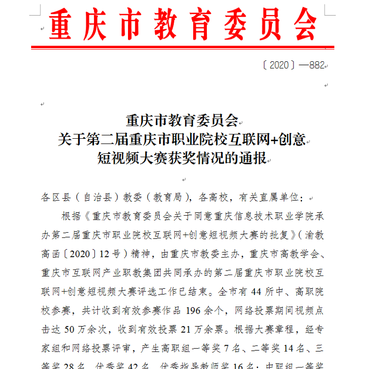 第二届重庆市职业院校互联网+创意短视频大赛由重庆市教委主办,重庆市高教学会、重庆市互联网产业职教集团共同承办承办。全市有44所中、高职院校参赛,共计收到有效参赛作品190余个。大赛旨在引导学生积极挖掘身边的美好事物,锻炼学生的实践动手能力,培养学生创业创新意识,促进参赛学校教育教学改革。
