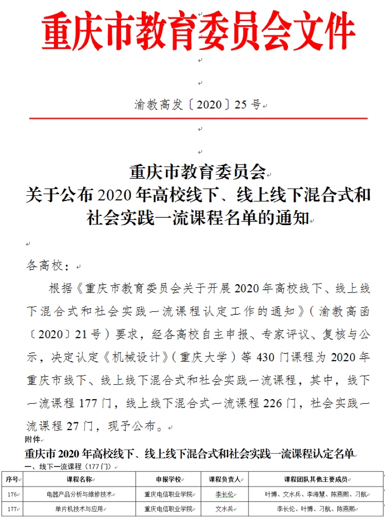 近日,从《重庆市教育委员会关于公布2020年高校线下、线上线下混合式和社会实践一流课程名单的通知》渝教高发〔2020〕25号文件中获悉,beat365李长伦老师负责的《电器产品分析与维修技术》和 文水兵老师负责的《单片机技术与应用》2门课程,获得重庆市2020年线下一流课程认定。此次公布的线下一流课程共计177门,其中职业院校课程共计46门,此项成绩的取得标志beat365课程建设取得重大突破。