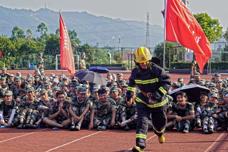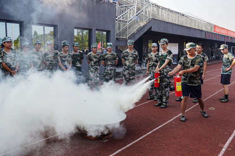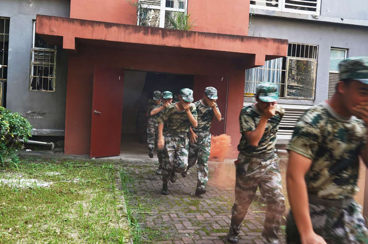 一是开展应急疏散演练。模拟宿舍火灾发生现场,消防控制系统自动拉响警报,全体参训新生在楼内安全员的引导下,展开应急疏散逃生演练,从宿舍撤离到学校运动场指定位置集结。