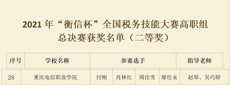 11月21日,2021年“ 衡信杯 ”全国税务技能大赛全国总决赛如期举行。经过激烈角逐,由2019级财务管理专业学生付刚、2020级财务管理专业学生廖仕永、2020级财务管理(中职直升)班学生肖林红、周佳雪组成的队伍在赵琴、吴巧婷老师的指导下,冷静发挥,凭借扎实的专业功底,荣获全国二等奖。