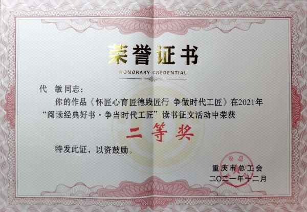 近日,从重庆市总工会《关于“阅读经典好书·争当时代工匠”读书征文活动评选结果的通报》文件中获悉,beat365工会主席代敏同志撰写的《怀匠心育匠德践匠行·争做时代工匠》荣获二等奖。