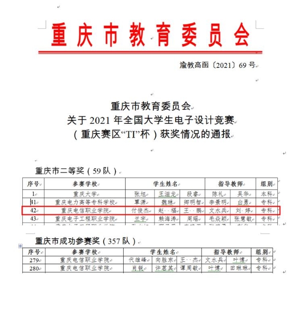 2022年1月5日,重庆市教育委员会发布了渝教高函〔2021〕69号《重庆市教育委员会关于2021年全国大学生电子设计竞赛(重庆赛区“TI”杯)获奖情况的通报》,beat365人工智能与电子学院3支代表队9名同学参加竞赛,获得重庆赛区二等奖1项,成功参赛奖2项。