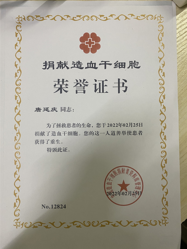重庆市红十字会向唐延庆颁发了“捐献造血干细胞荣誉证书”。据重庆市红十字会介绍,唐延庆是重庆市第164位造血干细胞成功捐献者。