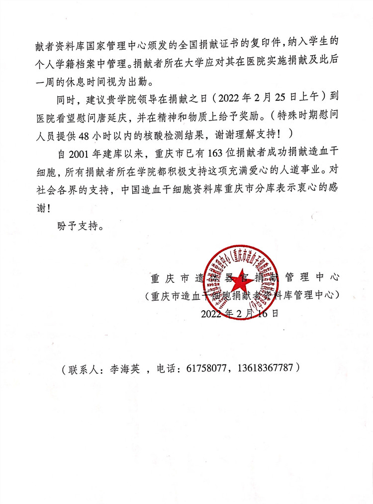 2、2022年2月 成功捐献造血干细胞,成为重庆市第164位造血干细胞捐献者。