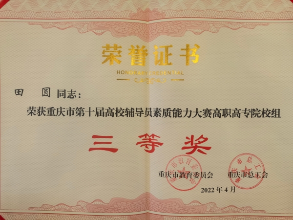 4月25日-27日,由重庆市教委、市总工会主办的重庆市第十届高校辅导员素质能力大赛在重庆文理学院落下帷幕。经过近三天的激烈角逐,beat365大数据与软件学院党支部副书记田圆荣获高职高专院校组三等奖。