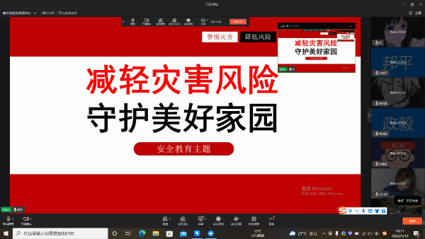 在疫情防控相关规定要求下,各学院采用线上线下相结合的模式,通过周末思想政治教育课堂、主题班会进行主题宣传。辅导员对各类灾害风险基本知识和防范应对技能进行宣传教育,特别是加强极端灾害性天气的风险识别和预警响应等内容的宣传普及,同时也开展了《突发事件应对法》《防洪法》《防震减灾法》《森林防火条例》和12350有奖举报投诉等政策法规的宣传,切实提高学生主动避灾避险的意识和能力。