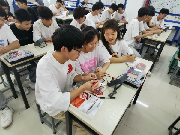 刘婷老师讲授《电子产品工艺及管理》课程,将本门课程挖掘的课程思政元素有机融合课堂教学,润物细无声的引导学生树立正确的学习观、职业观与价值观。通过对学生作品进行现场随机抽签、全班互动思考、教师点评等环节,明确实训目标、强化职业素养,积极营造“团队学习,超越自我”的学习氛围。