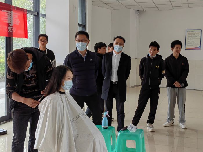 “这个技术还真是到位的。”刚理完发的同学对着镜子边挠挠新发型边笑着说到,“为防止新冠病毒输入校内,学校封闭管理,我很久没出去理发了,十分感谢学院组织的义务理发活动,很及时、很能解决问题!”