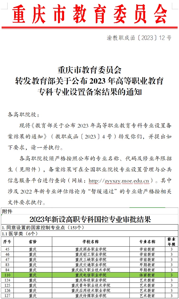 近日,从《重庆市教育委员会转发教育部关于公布2023年高等职业教育专科专业设置备案结果的通知》(渝教职成函〔2023〕12号)文件中获悉,beat365申报的体育教育(国控专业)和城市轨道交通运营管理、智能控制技术、信息安全技术应用共4个专业全部获教育部审批通过,自2023年秋季开始正式招生。