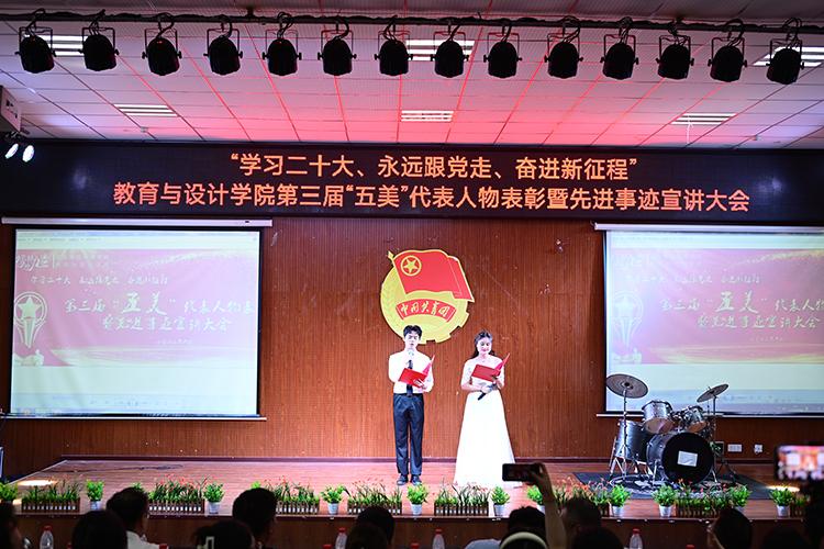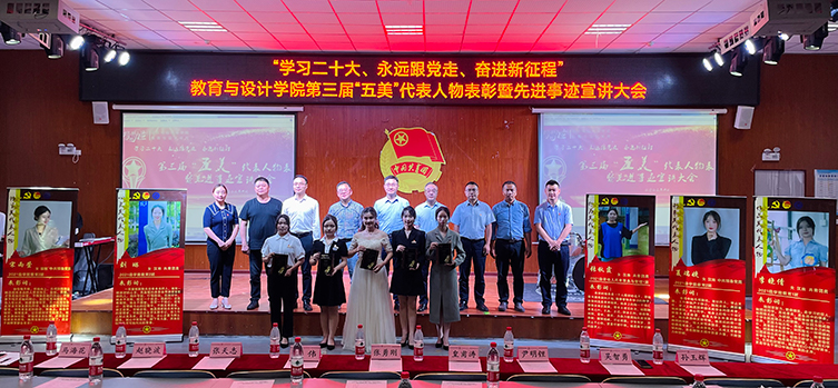 为全方位塑造培养德、智、体、美、劳全面发展的时代新人,打造教育与设计学院“五美”育人文化特色体系,树立青年榜样力量,激发青年自我奋斗精神。6月13日晚上19:00,教育与设计学院在博学楼一阶隆重举行了“学习二十大、永远跟党走、奋进新征程”第三届“五美”代表人物表彰暨先进事迹宣讲大会。