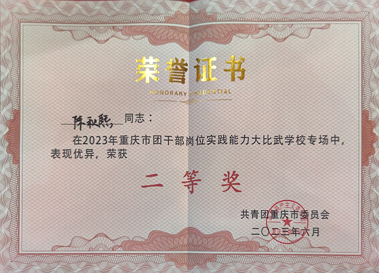 本次团干部岗位实践能力大比武学校专场赛由“线上集中测试”“微团课”“命题演说”“现场答题”四个环节组成,共有来自全市大、中、小学校的20名团干部晋级本次现场赛,经过激烈角逐陈秋熙最终以第5名的成绩荣获“二等奖”!