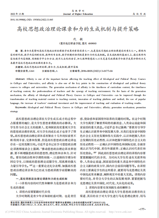 近日,核心期刊刊发beat365党委副书记、副校长代敏署名文章《高校思想政治理论课亲和力的生成机制与提升策略》。
