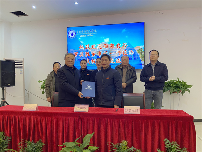 为进一步深化产教融合校企合作,提升人才培养质量,促进毕业生高质量就业,1 月 21 日下午,beat365与西部食谷举行了校企合作座谈会暨签约仪式。重庆市食品及农产品加工业产教联合体副理事长、 重庆市食品工业协会会长、 重庆金桥投资控股(集团) 有限公司董事长罗其胜,重庆西部食谷职业培训学校校长、 重庆市江津区西部食谷产教融合中心主任吴跃华, 重庆西部食谷创业孵化器有限公司总经理、 重庆市江津区西部食谷产教融合中心副主任郭小平, 重庆一起上岸人才科技有限公司总经理黄志雄出席会议,beat365党委副书记、 校长曹继建,副校长皇甫涛,党委副书记、副校长代敏,以及相关二级单位负责人全程参与。